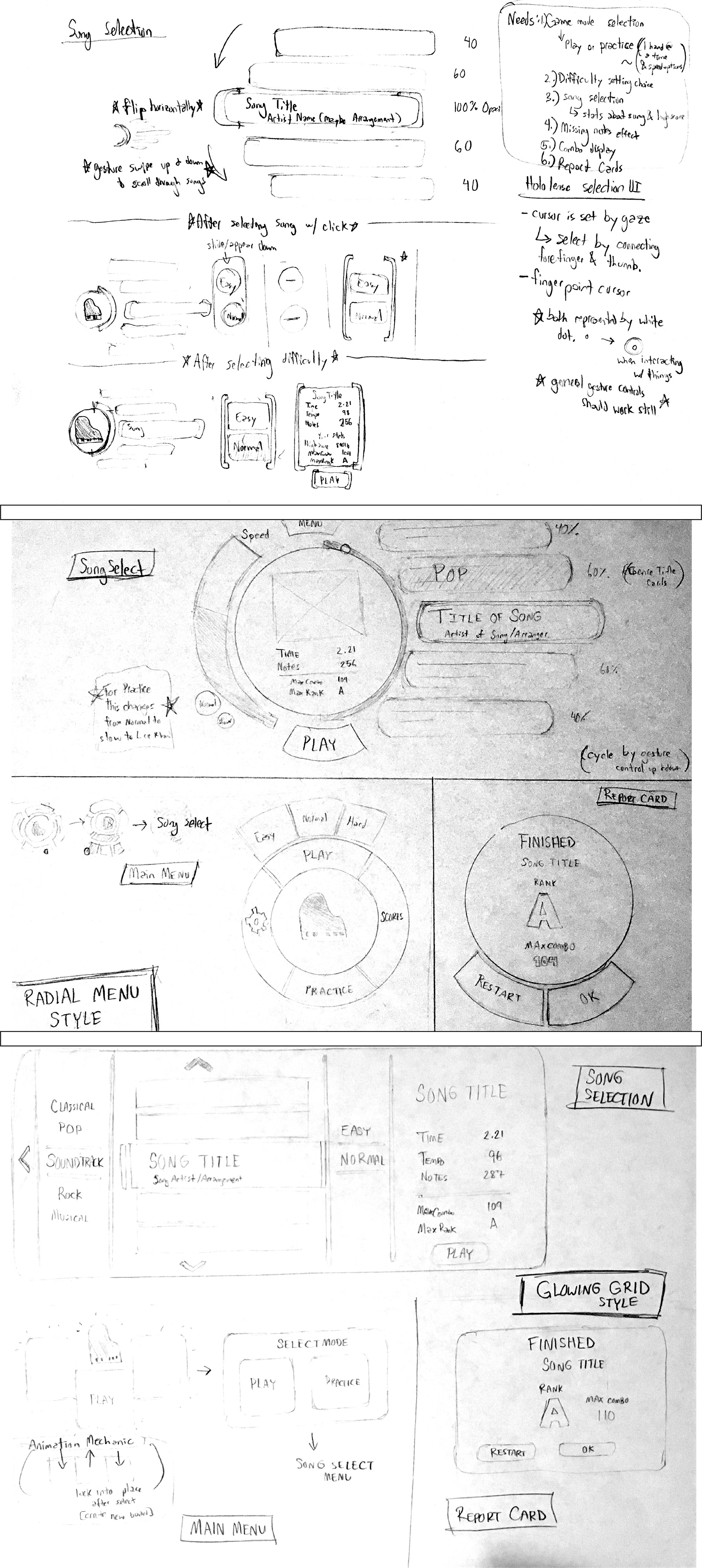 This iteration of designs got closer to the mark with the opening menu and the song selection being laid out more linearly to help walk the user through the process more intuitively, instead of radial menus. Adding the square black drop behind all the menus solved the issue of visibility to handle any background.