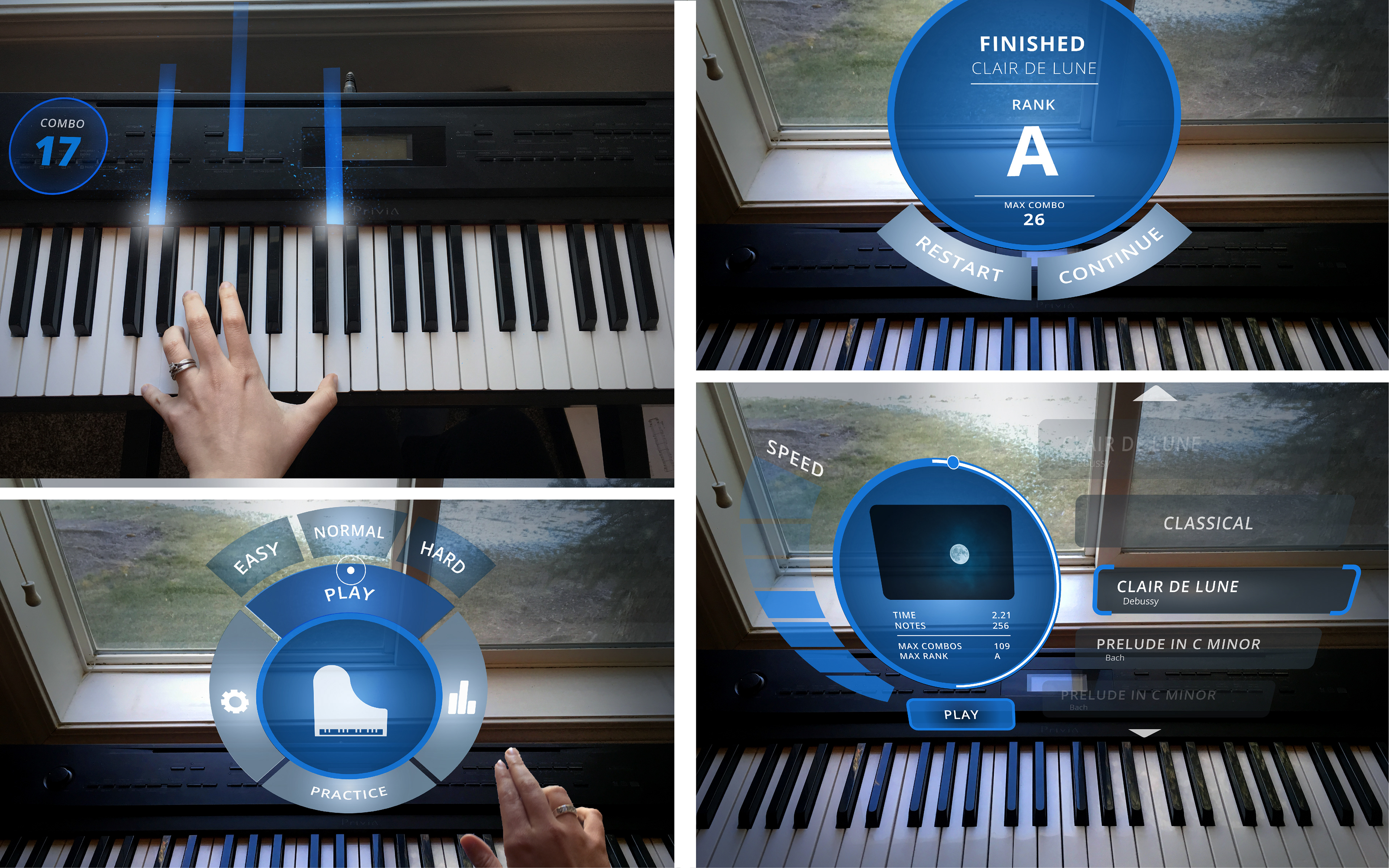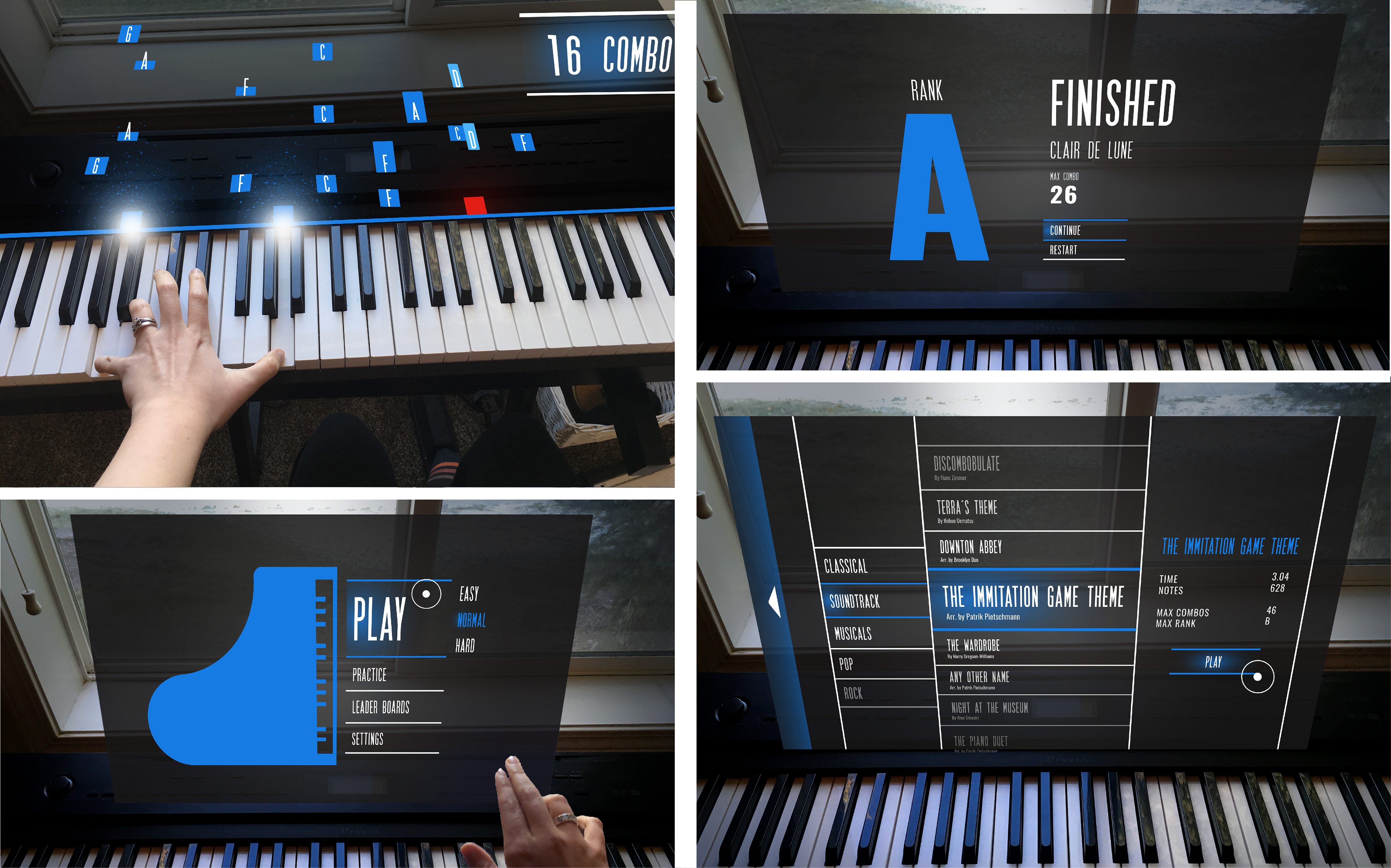 The final design shows the capability of AR headsets for want to be piano players. This AR rhythm game allows players to pick a song and just start learning how to play, with options to practice at slower tempos to perfect their playing. The simplistic and jazzy design make it a cool and relaxed way to learn songs on the piano without ever having to know how to read sheet music.