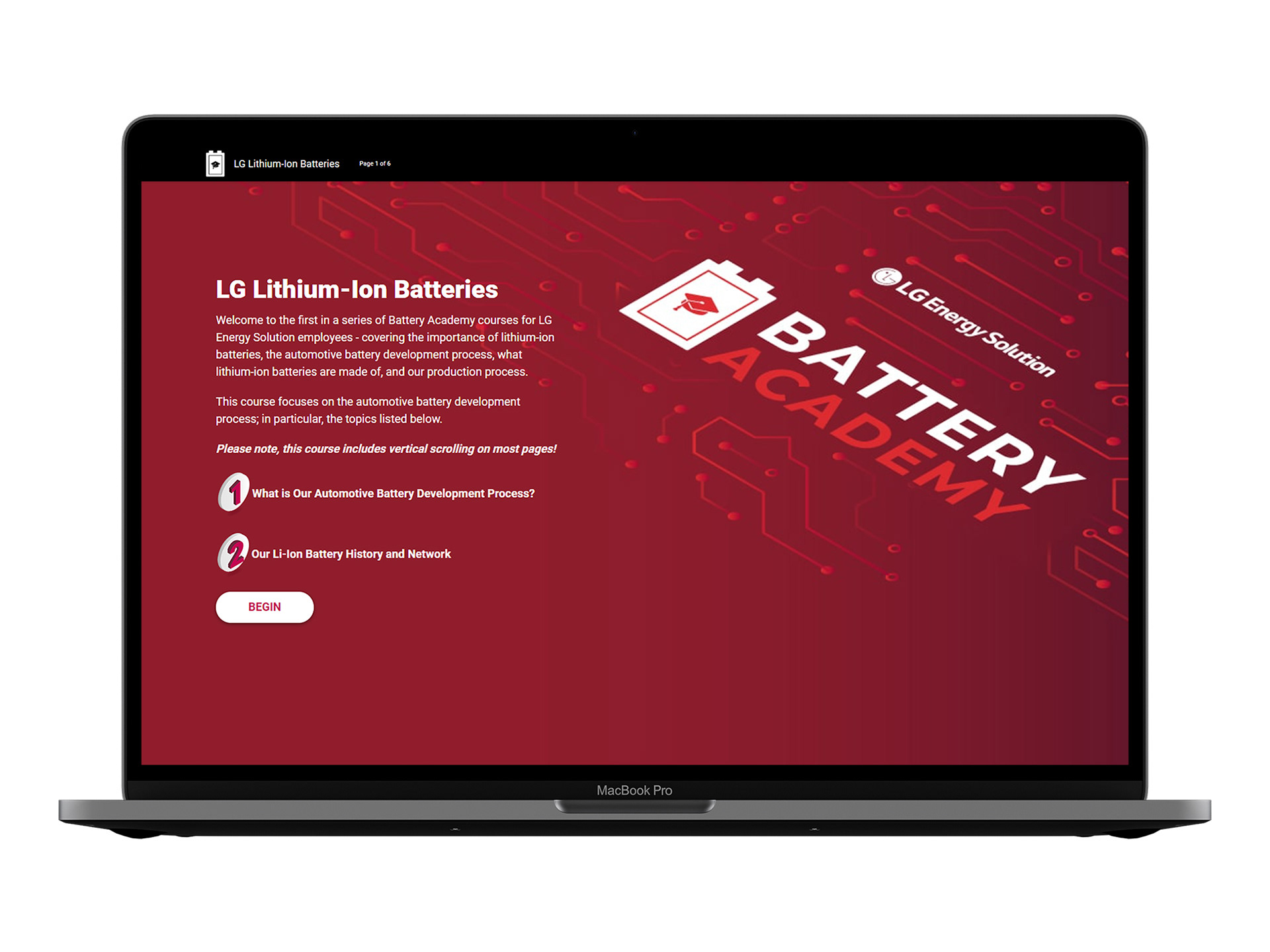 In the end, we decided on the most minimal of the logos for the eLearning's brand. While the ideas of academic emblems were fun to explore, ultimately the use cases for this logo were going to be mostly shown in it's smallest form in the navigation bar of the eLearnings, so we needed something that translated well to a smaller size. And the minimal logo definitely fit that need, while still showcasing LG's battery design.