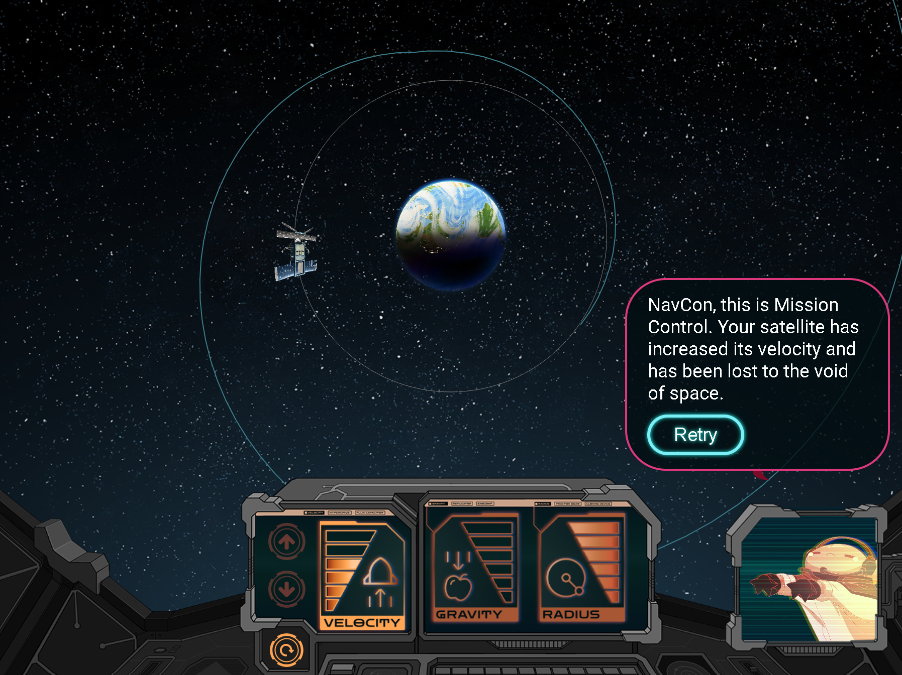 This was a UI set I designed and illustrated for an interactive STEM learning course that took place in space, and revolved around launching a satellite into space. For this interactive simulation I was able to design a diegetic space HUD where students manipulate the velocity of their satellite to try and form a stable orbit.