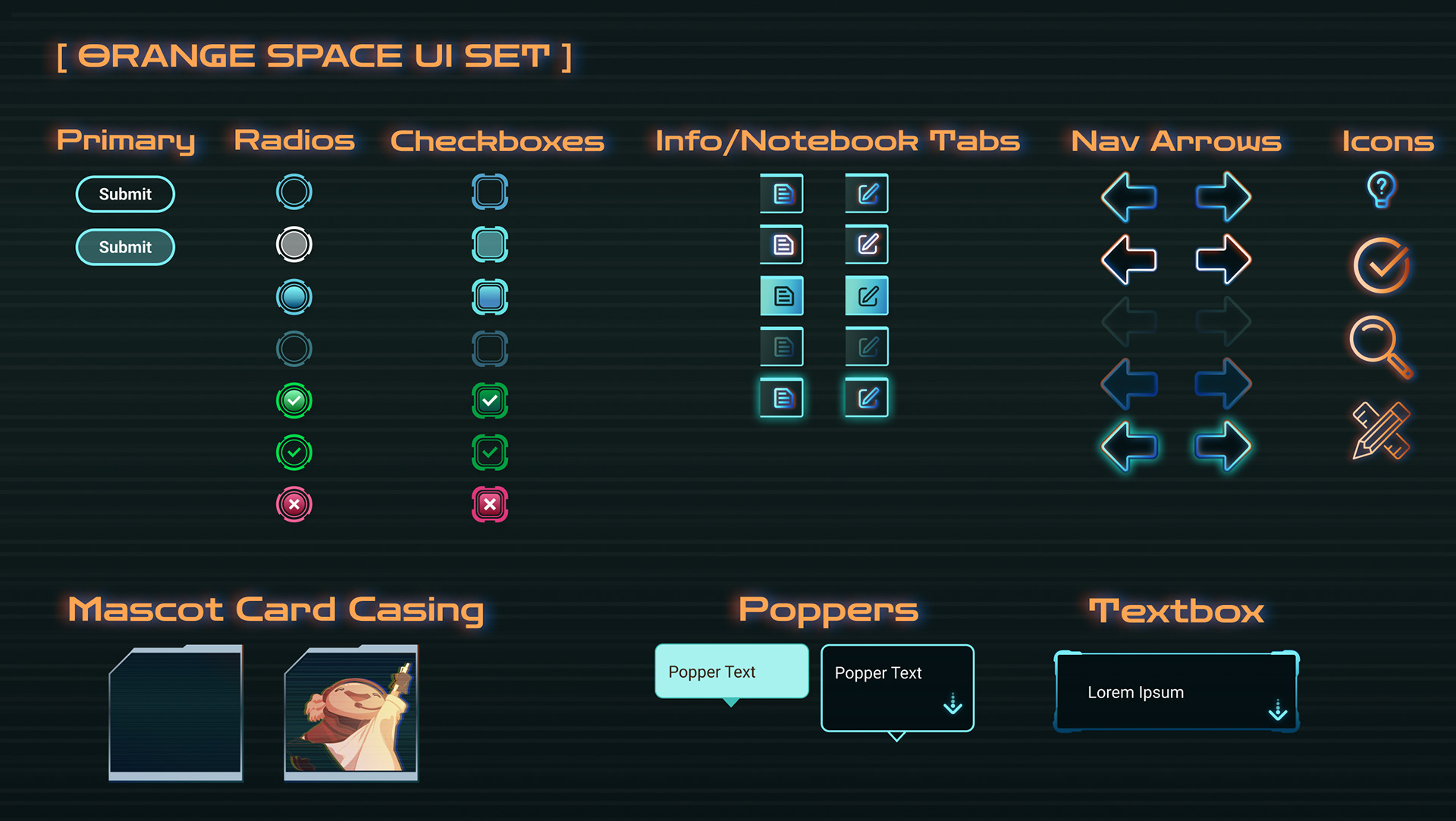 Beyond the main set piece of the spaceship HUD, I also designed specific UI elements to match the dark, orange and blue space theme to match the overall art direction of the project.