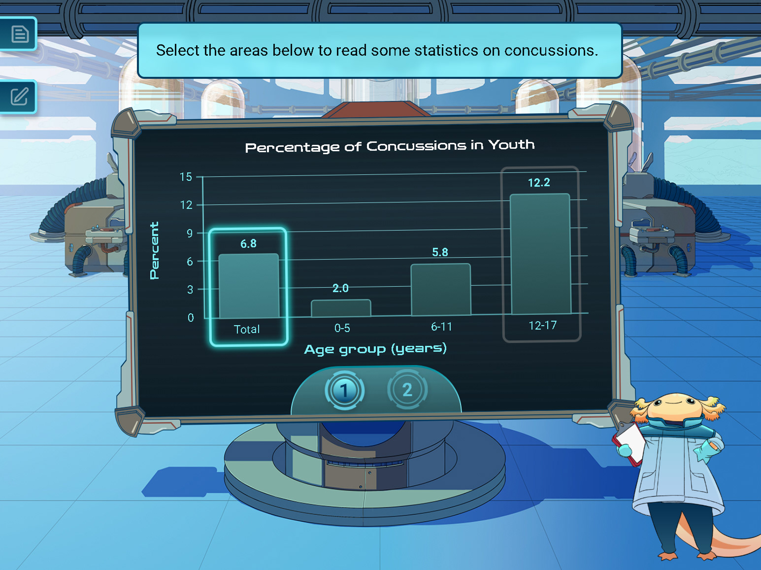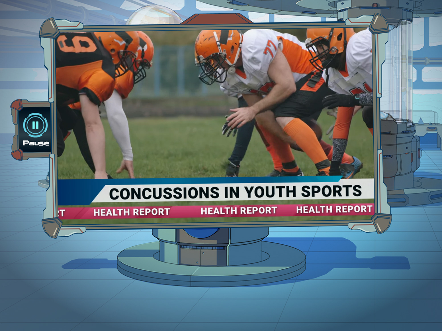 These are two diegetic UI pieces I designed and illustrated for an interactive simulation eLearning course aimed at middle school students learning about concussions. Both props had to be designed to match the illustrated backgrounds of the course, which had a specific style and color palette to match.