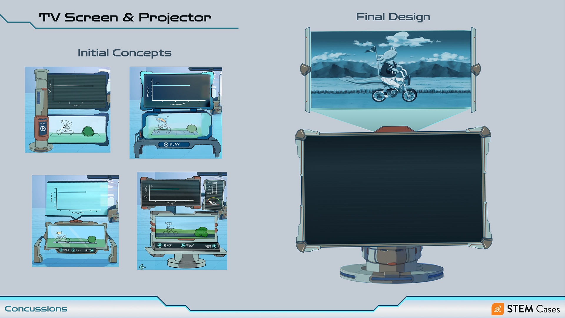 The TV & Projector were designed to house a number of different illustrations, videos, and graphs through the course, allowing for on-screen buttons to appear and be pressed by the user. Beyond that functional requirement, it had to also fit in the same visual universe as the background and other props designed for this course. I kept in close contact with the art director and 2D illustrators during group check-ins to ensure our designs matched aesthetically.