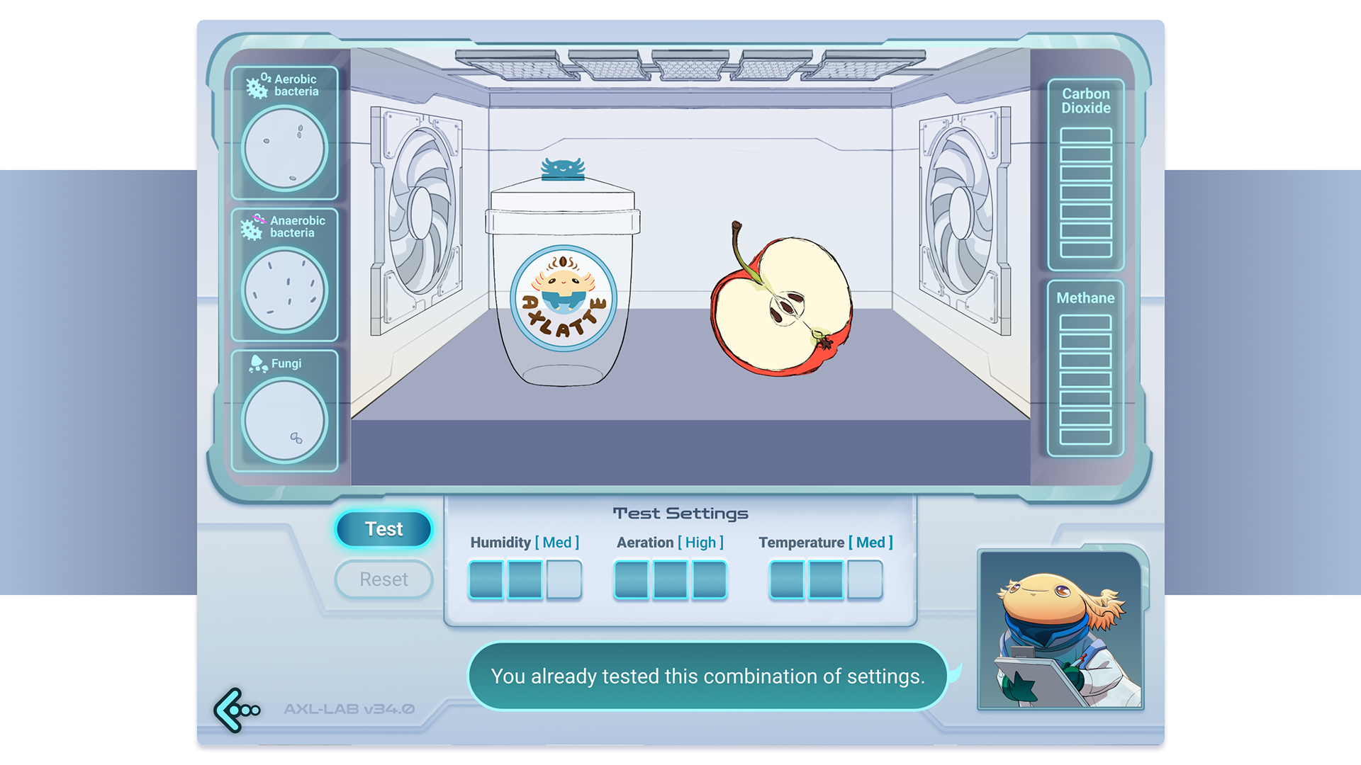 One legitimate concern emerged. Students wanted to retest conditions but couldn't remember what they'd already tried. Technical constraints prevented us from displaying a history of past tests. Our solution was to have the mascot warn students when they've queued a combination they've already tested, while still letting them run it again if they want. This prevented circular experimentation without blocking intentional retesting.