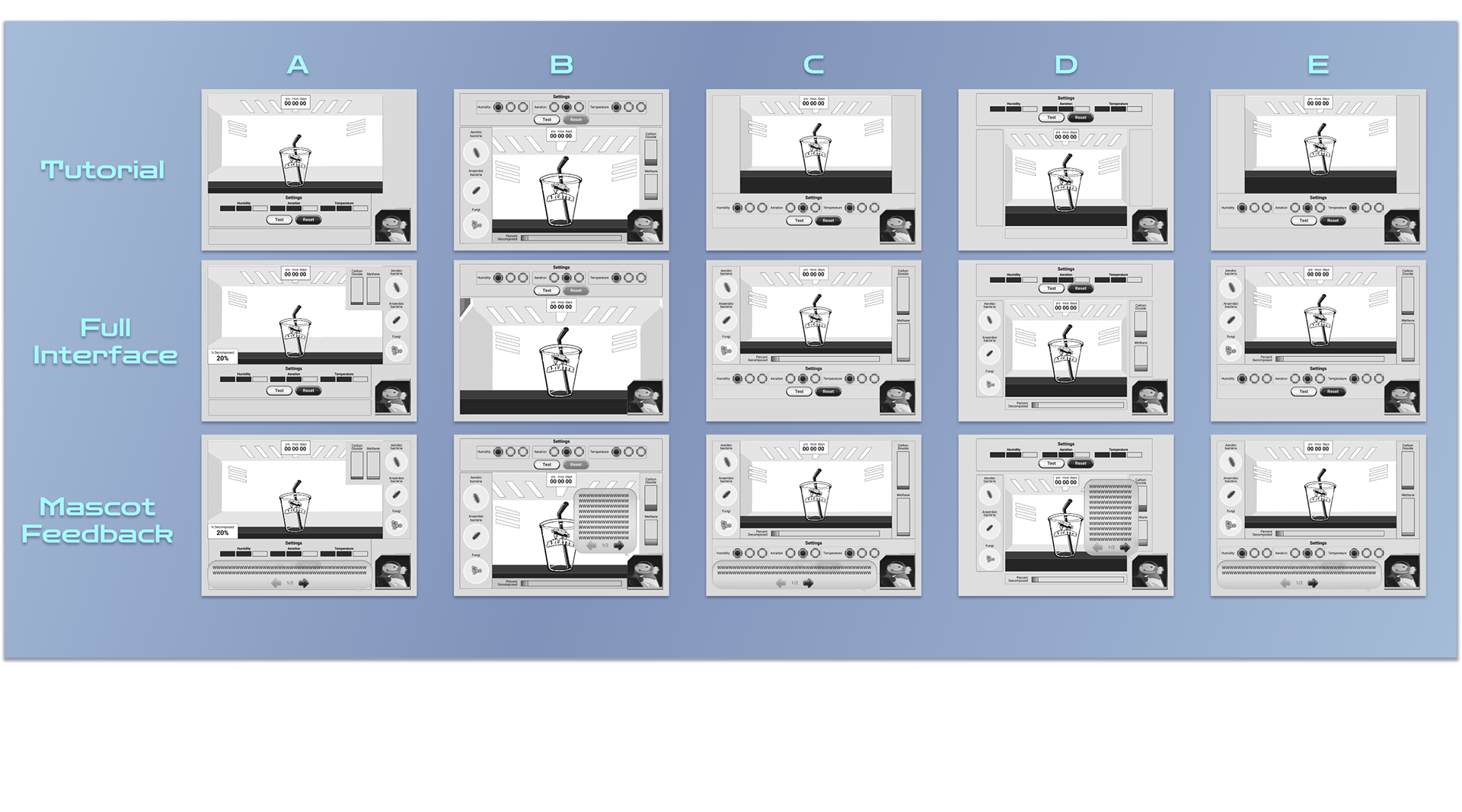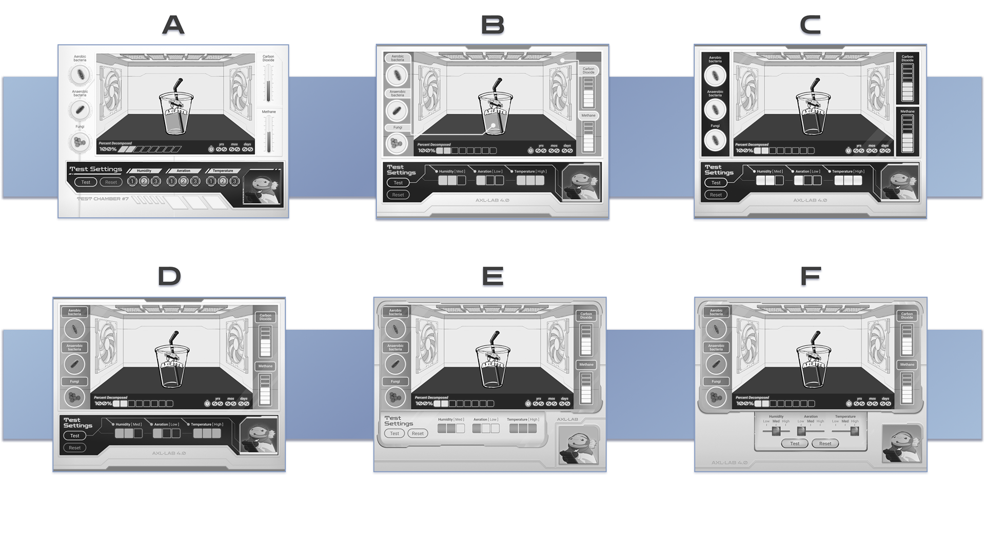 Here's what I was wrestling with: the testing chamber needed to dominate the screen, but I also had to fit three microorganism displays, a timer, a decomposition bar, two gas meters, and our mascot character, who delivers feedback in a speech bubble.