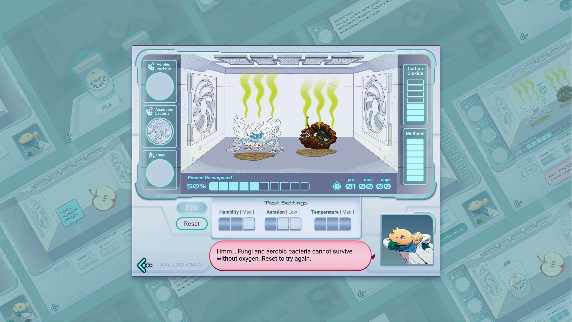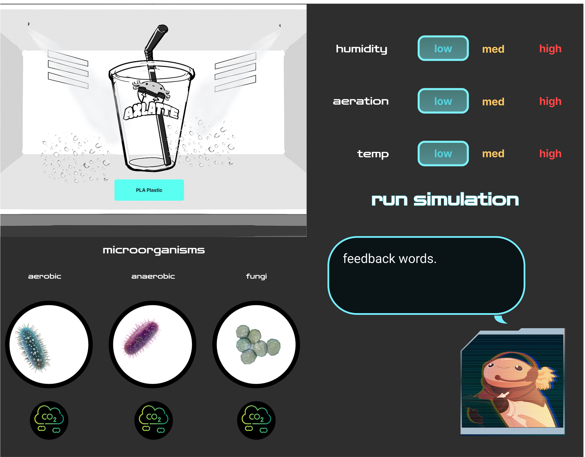 We created a virtual testing chamber to teach middle schoolers about carbon cycles and decomposition. In this chamber, students can test plastic cups made from renewable resources and observe how they decompose under various environmental conditions.