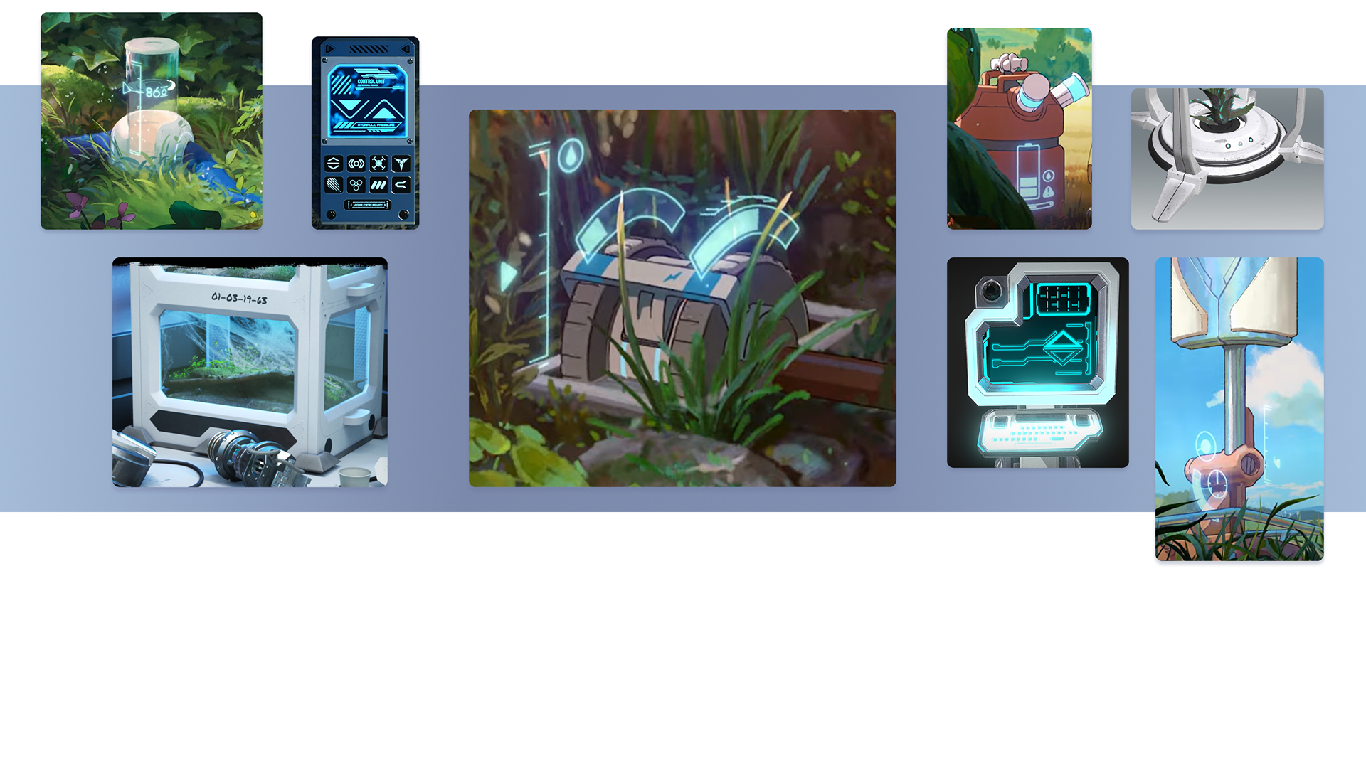 I pulled visual research from the solar-punk aesthetic: clean floating interfaces, monochrome schemes, crisp white machinery. The goal was diegetic UI, making students feel like they're operating actual lab equipment in a pristine research facility. The art director and I aligned on this direction early in the production pipeline, which freed up the illustrators to work in the same visual style concurrently with other course assets.