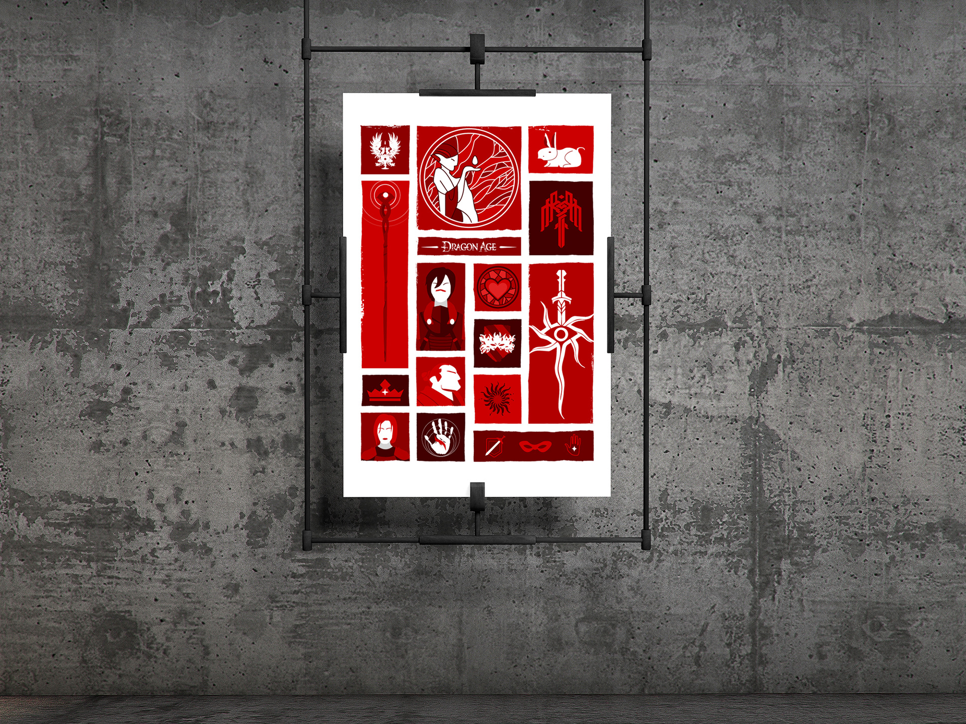 This was a personal project I designed as a big fan of the video game series: Dragon Age. I stuck with a monochromatic red theme as that is the original color scheme of the game logo. And then I illustrated minimal renditions of famous characters, icons, and symbols from the game franchise to fit into a worn grid design.