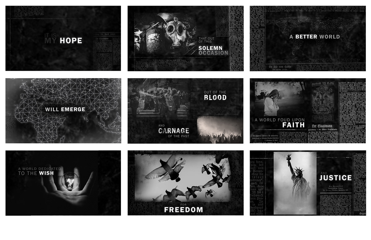I wanted to take a sort of dark, newspaper feel to compliment the tone of the quote. Including black and white images that are worn on the edges to reinforce the idea of coming forward from history. As well as having the images, type, and newspaper text be on different planes to create a parallax effect, creating a good amount of depth and visual interest while the camera moves through.