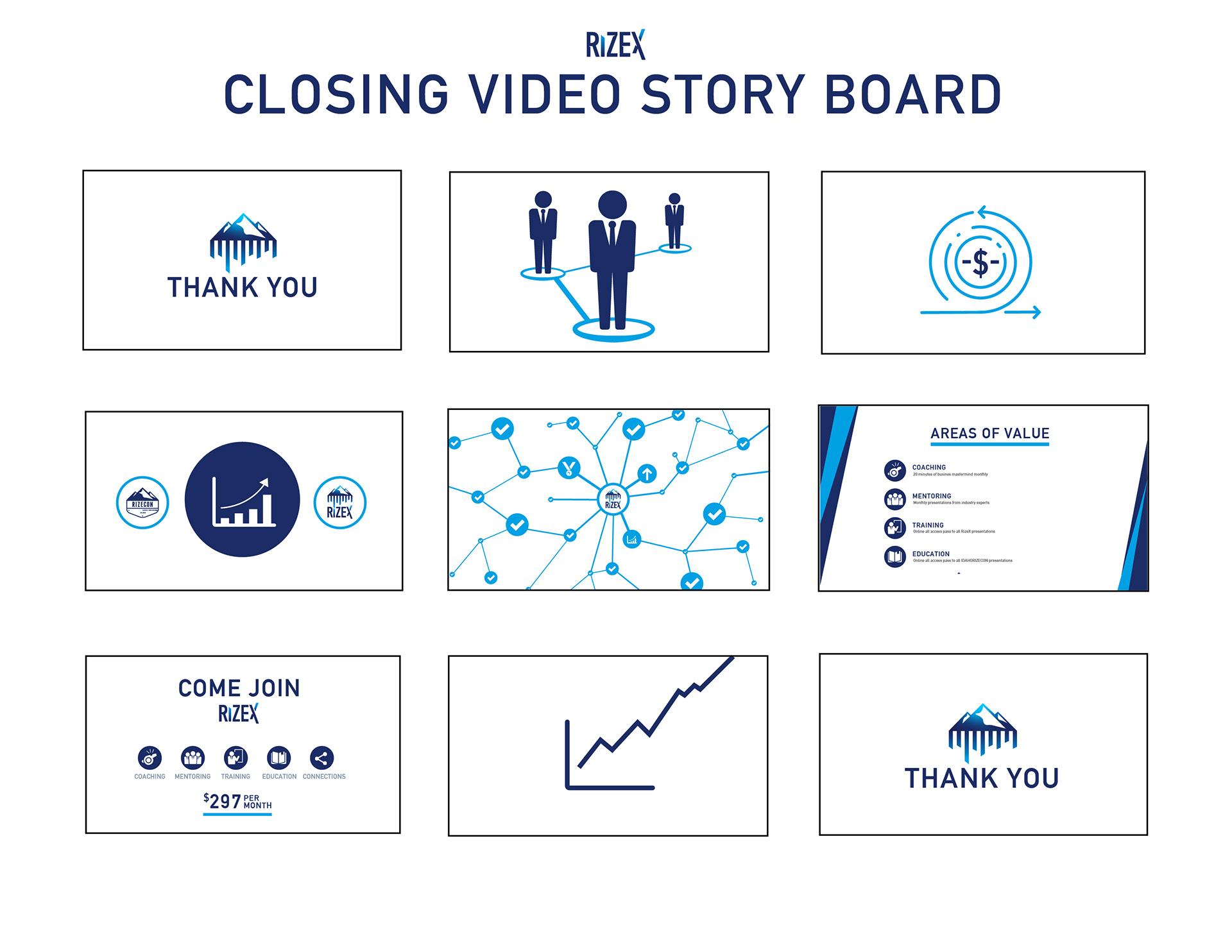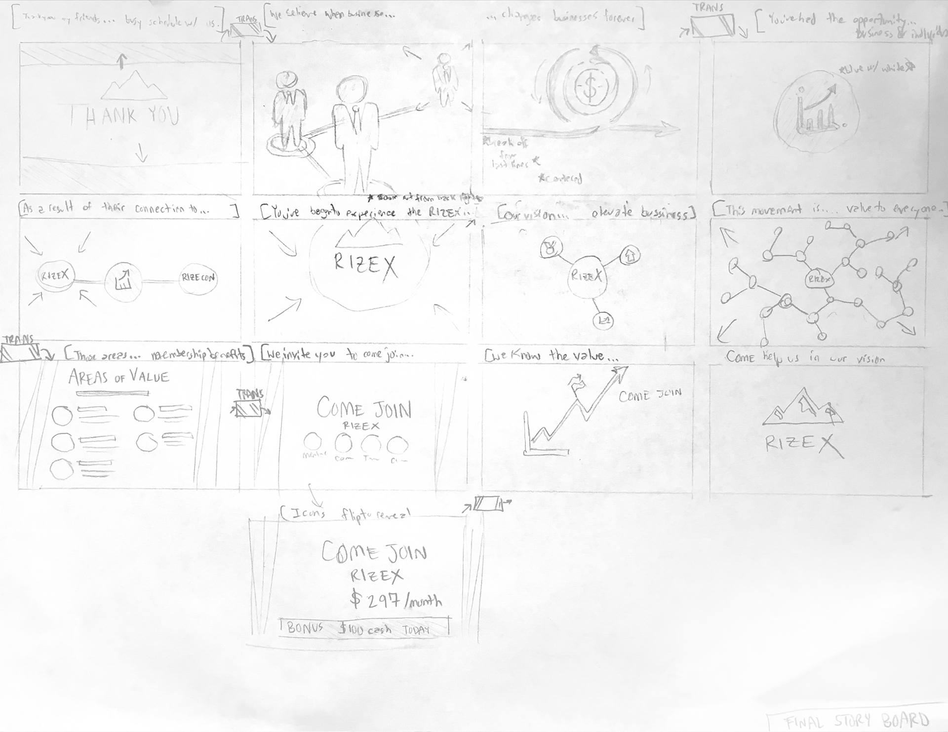 This closing video was created to be played at the end of a RizeX event (a business networking conference). It's purpose was to recap the values of RizeX as well as present to those attending the benefits of becoming a member of RizeX. I wanted to keep the video within the same branding feel of the RizeX logo that had been previous designed, so the entire color palette was pulled from the logo. My goal with the visuals of the video was to create simply understood visuals to support the provided script, and to help visualize the benefits of being a member of RizeX.
